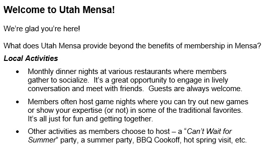 Utah Mensa Contacts Locsec: locsec@utah.us.mensa.org Membership:Rachel Kibler: rachelregion9@gmail.com |